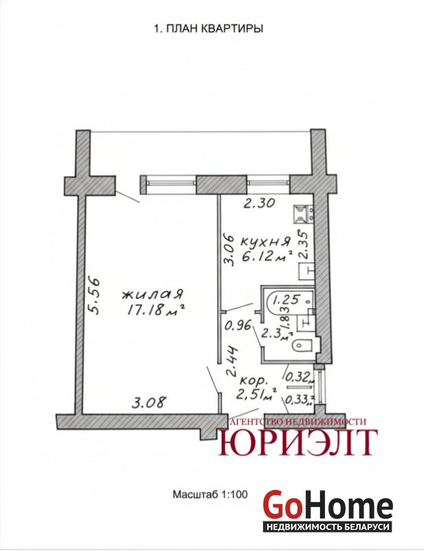 Общая площадь — 30.2 м2. Просторная жилая комната — 17.18 м2.
