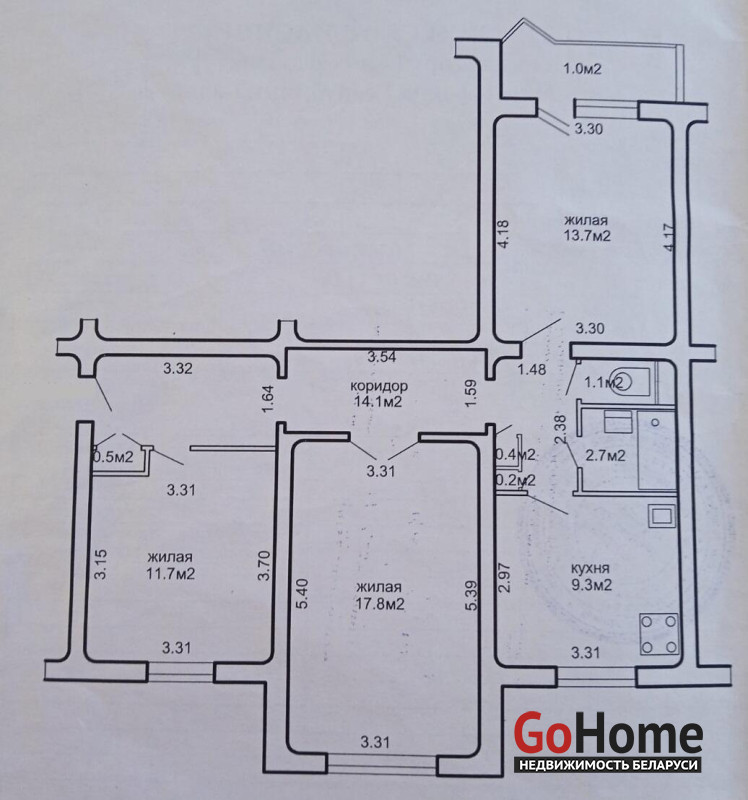 Кухня 9.3 м2. Просторные светлые комнаты 17.8 м2, 13,7 и 11,7 м2. Площадь по СНБ 72,5 м2.