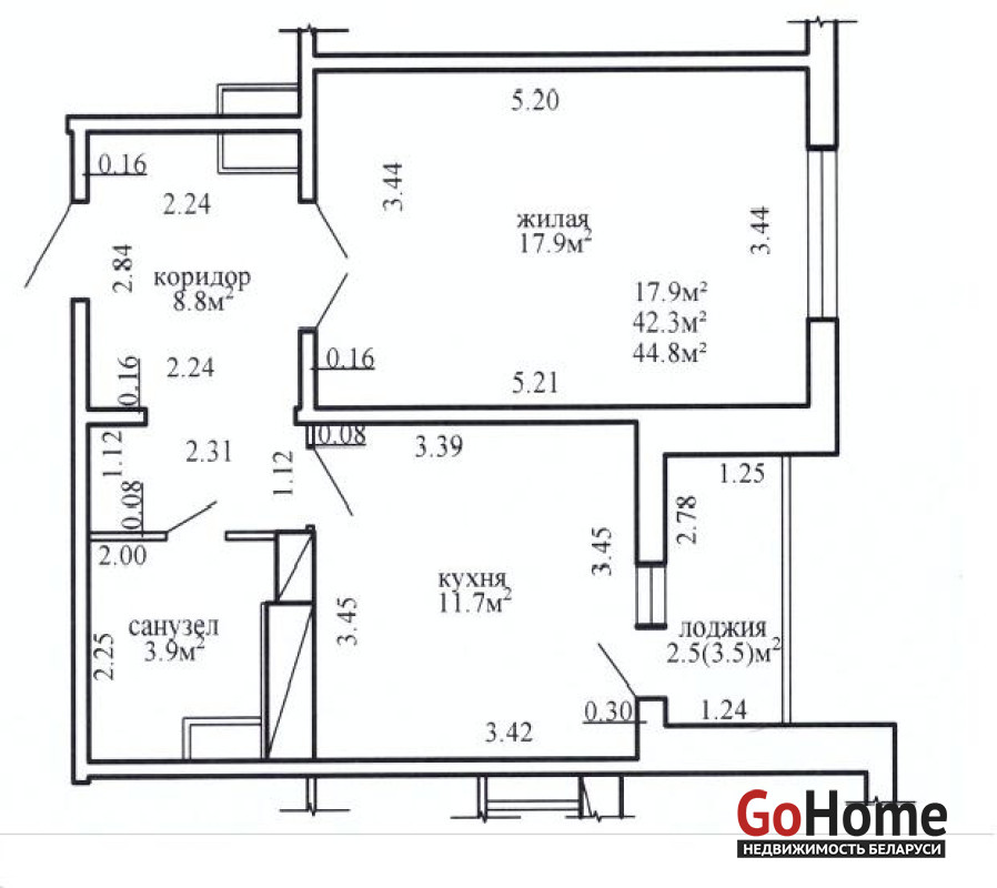 В квартире расположены – жилая комната площадью 17,9 м.кв., большая кухня площадью 11,7 м.кв., совмещённый санузел площадью 3,9 м.кв., коридор площадью 8,8 м.кв. и лоджия площадью 3,5 м.кв. Высота помещений – 2,66 м.
