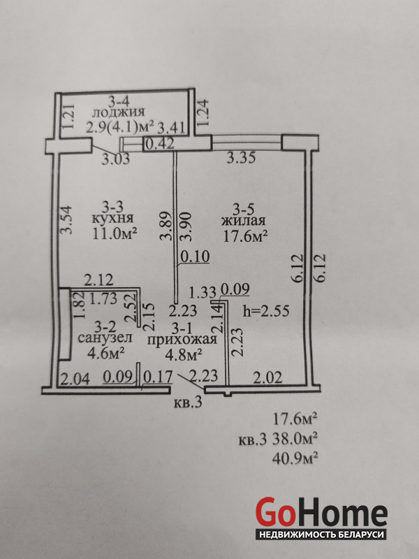 Квартира расположена на первом этаже 11-этажного панельного дома. Площадь — 40,9 кв.м. Жилая площадь — 38 кв.м, в комнате есть ниша (17,6 кв.м). Кухня (11 кв.м) оснащена газовой плитой и выходит на застекленную лоджию. Совмещенный санузел оборудован унитазом. Удобная прихожая (почти 5 кв.м).
