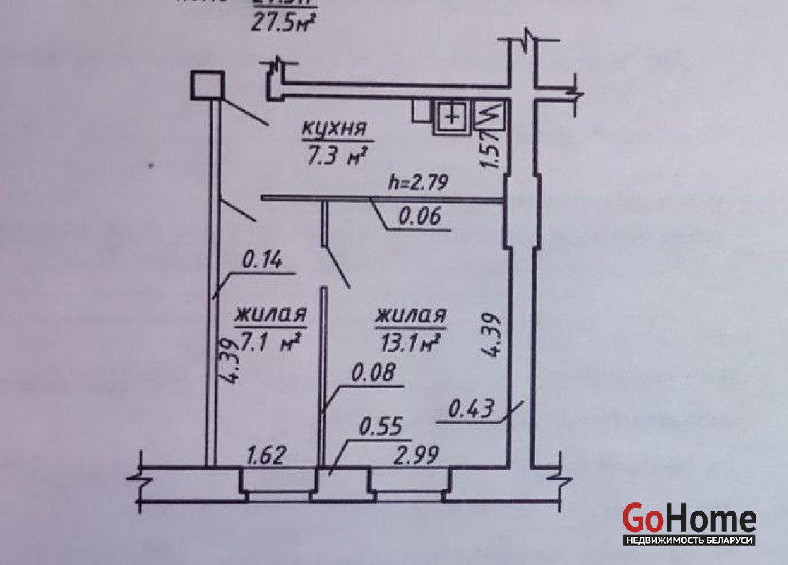 Общая площадь 27.5 м²: жилая — 20.2 м², кухня — 7.3 м².