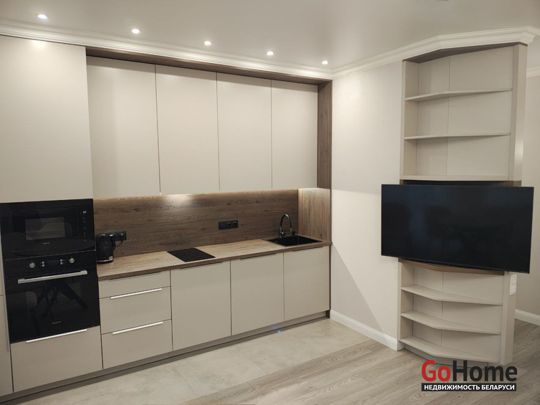 В кухонной зоне разместились встроенный бесшумный холодильник, духовой шкаф, микроволновая печь, индукционная плита и бесшумная вытяжка, посудомоечная машина, эл.чайник, а также робот-пылесос.