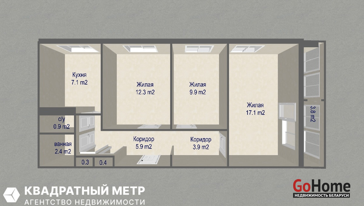 - Жилые раздельные комнаты: 17,1 кв.м., 12,3 кв.м., 9,9 кв.м.