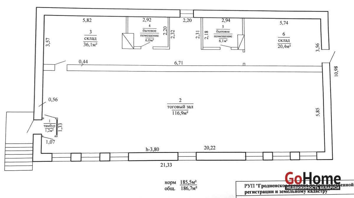 Кирпичное строение площадью 186.7 м2, нормируемая 185.5 м2 .