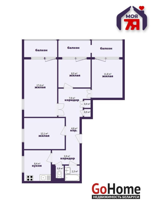 4‑комнатная квартира 82,8 кв.м. с тремя балконами