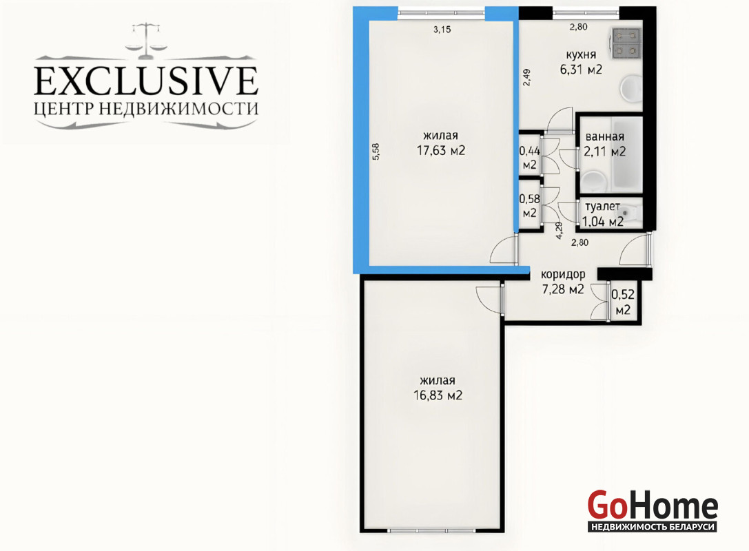 · общая площадь квартиры 52.74 м2; жилая площадь 17,63 м2; кухня 6.31 м2