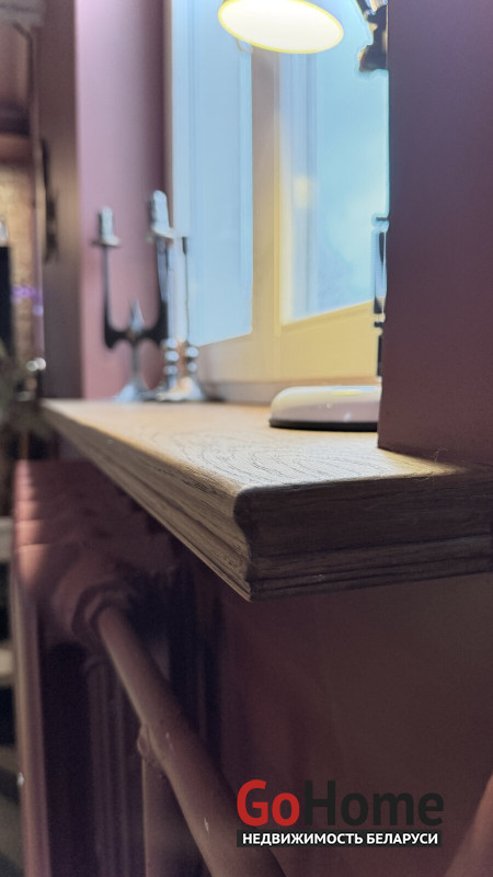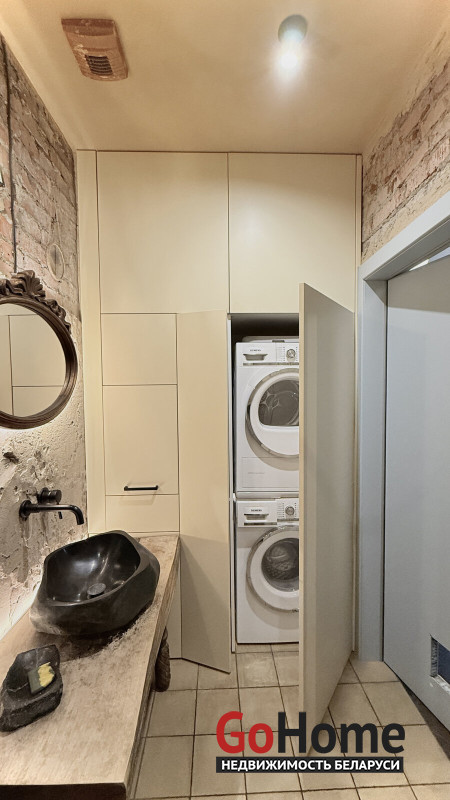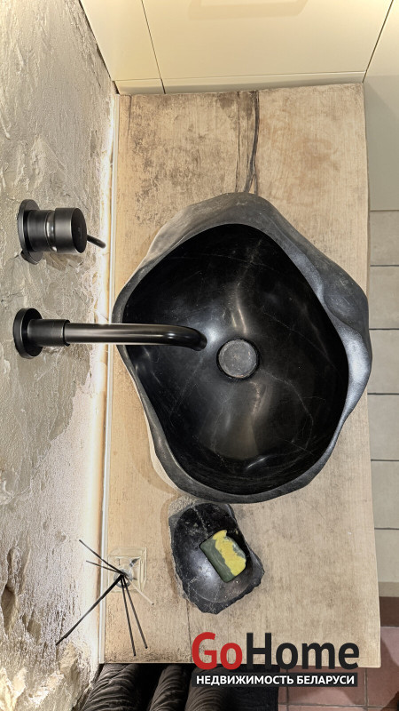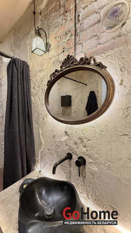 Ванная комната. Раковина из натурального камня сделана на заказ. Консольный стол под раковиной и Смеситель, AltroBagno. Зеркало, винтаж. На стенах оставлена фактура после сбитой плитки. Стены затонированы и покрыты защитным лаком.
