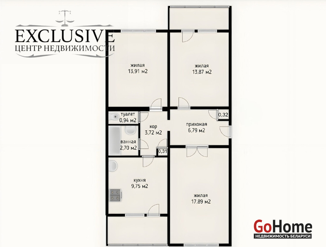 В квартире удачная планировка (окна выходят на обе стороны дома) : 2 остекленных стеклопакетом балкона (выход на один из которых из кухни); все три комнаты изолированные, что является большим плюсом для комфортного проживания; кухня просторная, имеет площадь 9.75 кв. метров; сан.узел раздельный.