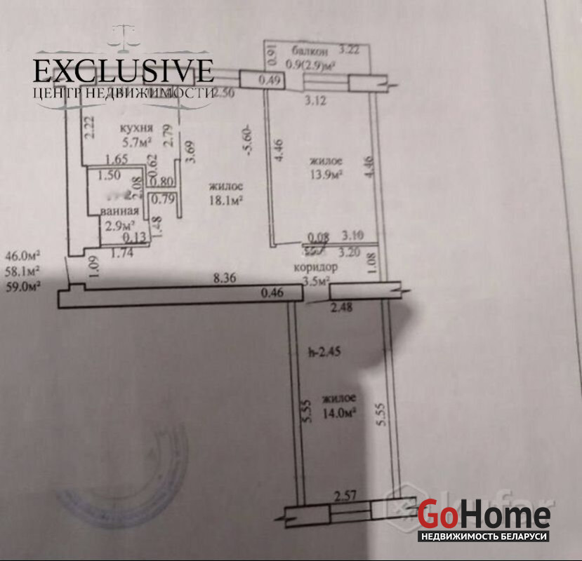 Общая площадь 58,1, жилая 46,0, кухня 5,7. Квартира теплая, светлая. В квартире выполнен ремонт из качественных строительных материалов!!!!!