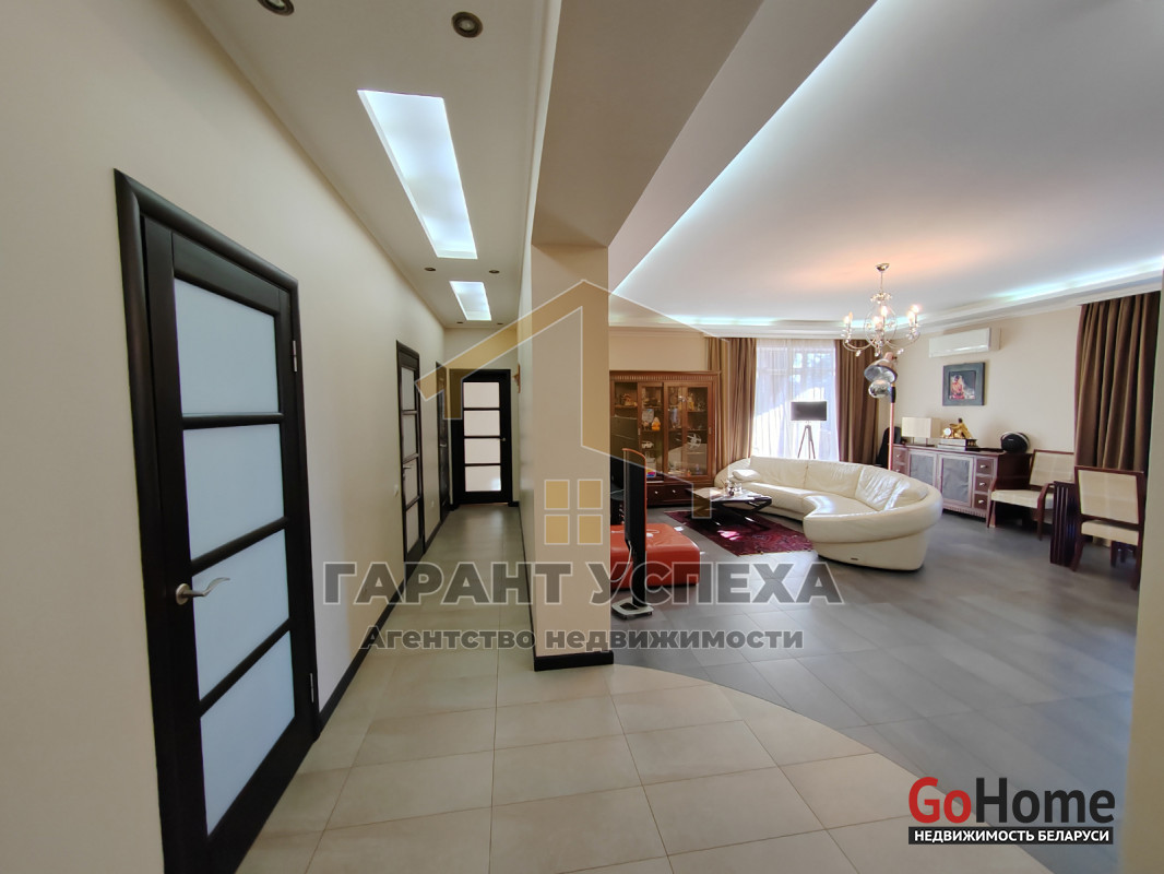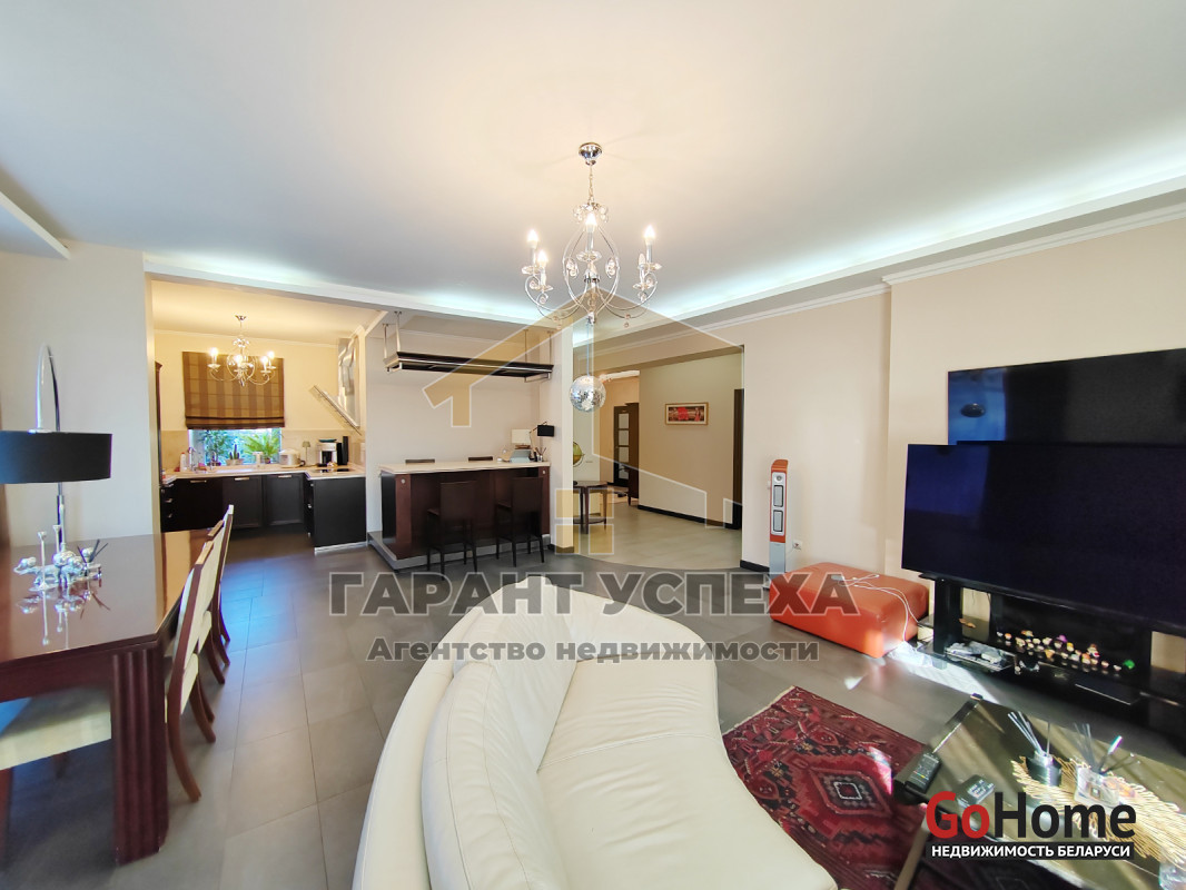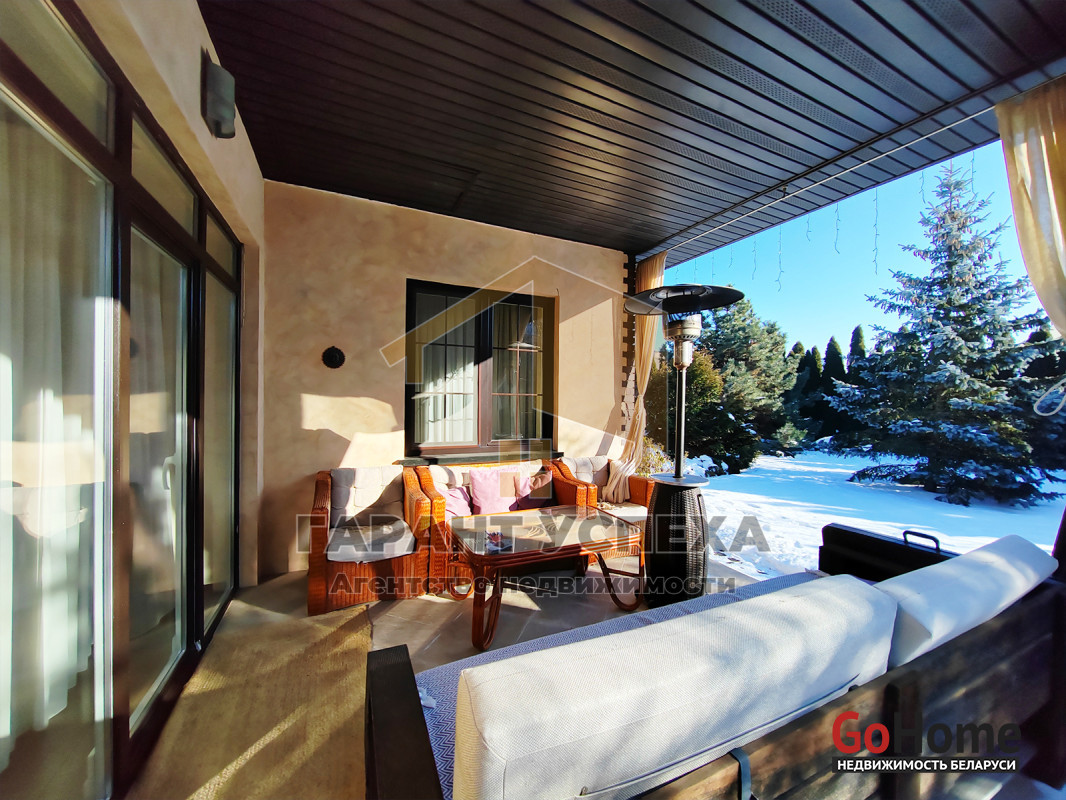 Общая площадь здания составляет 172,5 кв.м, жилая – 76,9 кв.м. В доме имеются четыре жилые комнаты, одна из которых просторная гостиная. Именно гостиная, совмещённая с кухней является своеобразным сердцем всего дома и занимает площадь без малого 50 кв.м. А большие панорамные окна и выход на крытую террасу делают его максимально светлым и уютным. Помимо описанных помещений в доме имеются два совмещённых санузла (один из которых имеет дополнительный вход из мастер-спальни), прихожая, гардеробная - так необходимая каждой девушке и топочная. А автомобильный гараж с автоматическими ролетными воротами имеет прямым вход в прихожую.