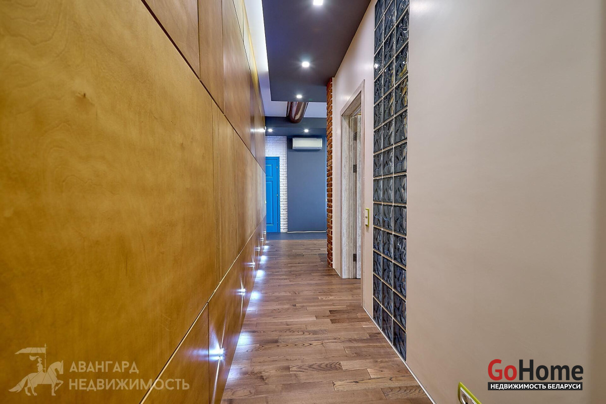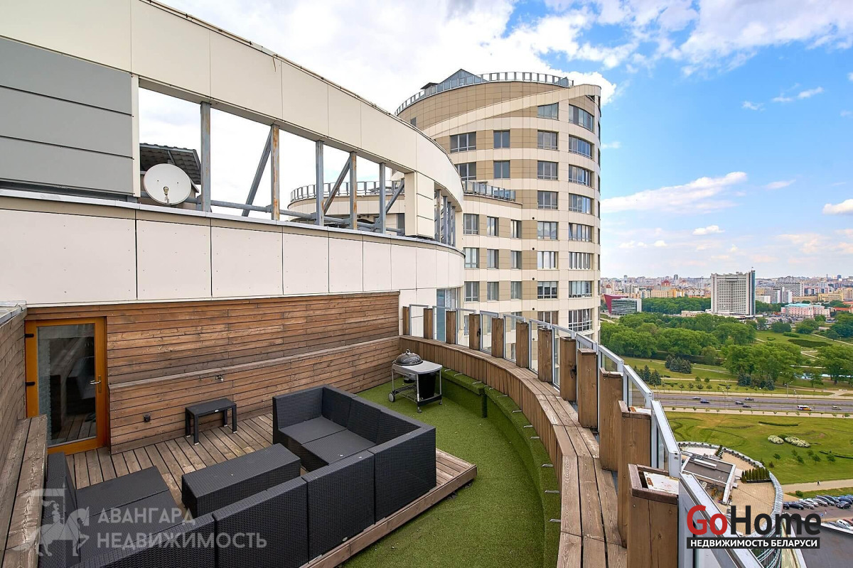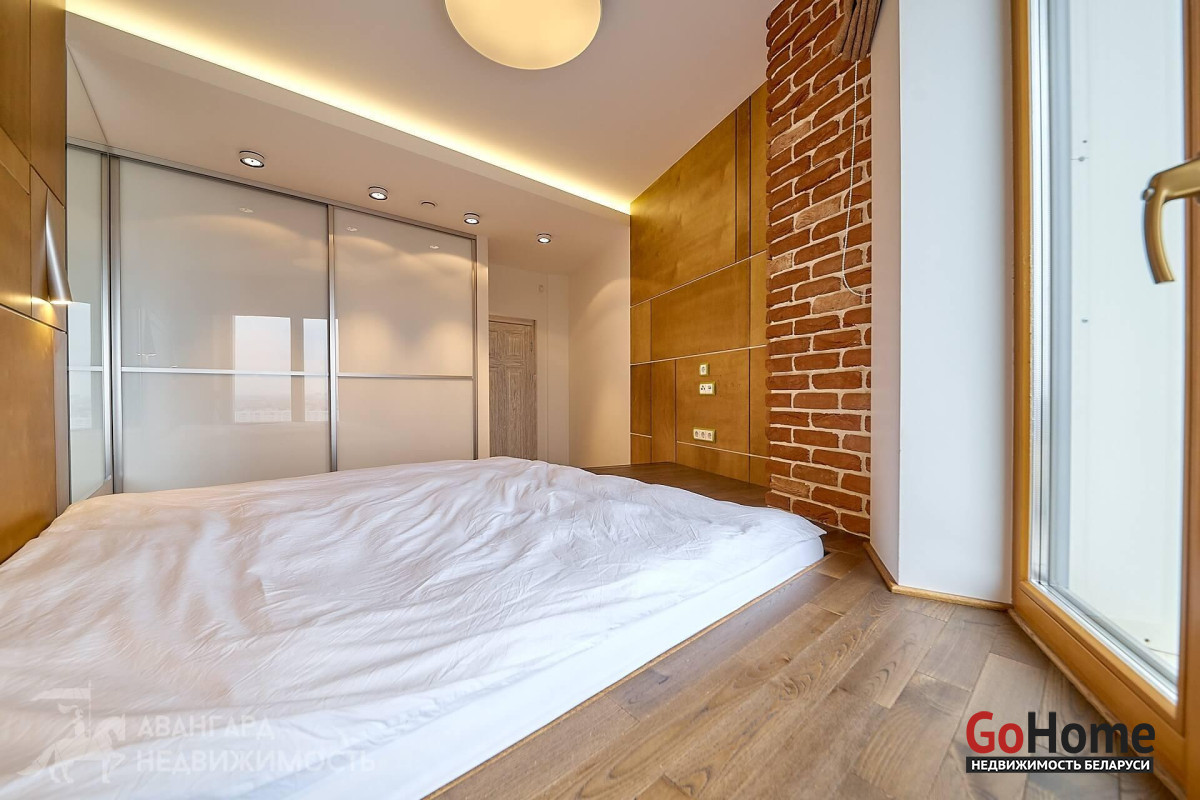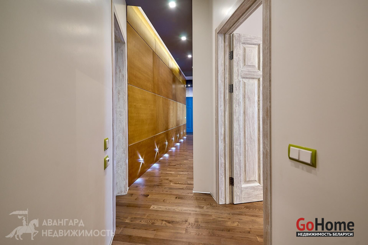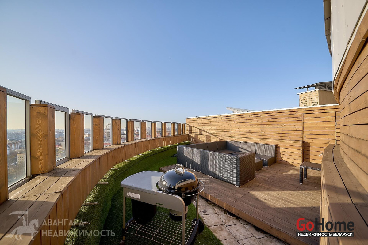 Удобная планировка: просторная кухня-гостиная 37.5м2, объединенная с балконом, жилая комната (детская либо рабочий кабинет), спальня, гардеробная, два санузла с душевой и ванной, постирочная комната, кладовая. собственная открытая терраса - замечательное место для приема гостей и семейных вечеринок. большие панорамные окна, откуда открываются живописные виды на Немигу, набережную Свислочи, парковую зону. Солнечная юго-восточная сторона света. Высокий этаж обеспечивает тишину и спокойствие, отсутствие шумных соседей сверху. Квартира укомплектована современной мебелью и техникой. - в отделке использовались качественные материалы. Сделана дополнительная шумоизоляция. Умная входная дверь Dierre (вход без ключа по карточке/чипу), видеодомофон, сигнализация, кондиционер. Окна дерево + алюминиевый профиль, выключатели и теплые полы Gira, светильники Delta Light, стеновые панели – шпон дуба, напольное покрытие паркетная доска, дубовая лестница и межкомнатные двери, в коридоре двери Dierre. Терраса – лиственница, мангал Weber.