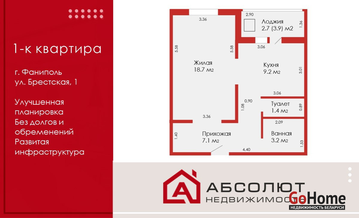 Продается большая 1-комнатная квартира в одном из самых уютных городов-спутников вблизи г. Минска.