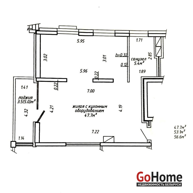 Площадь по СНБ 56,6 м кв. Квартира свободной планировки