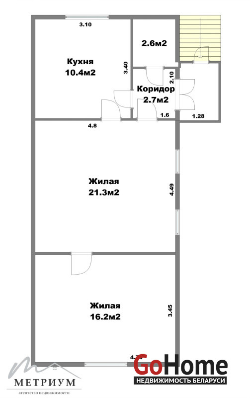 В квартире 2 жилые комнаты 21,3 кв.м., 16,2 кв.м., кухня 10,4 кв.м. и сан.узел 2,6 кв.м. Есть электричество и газовое отопление, канализация.