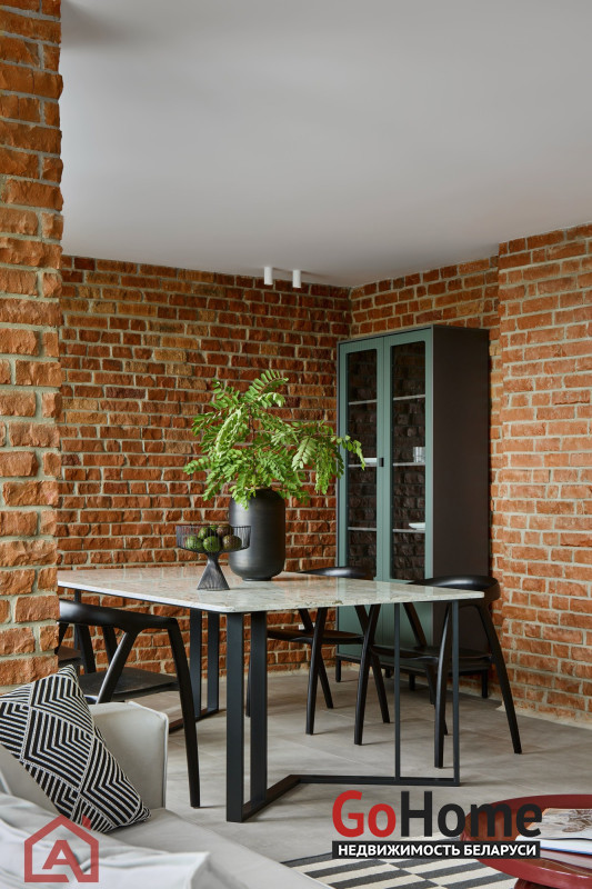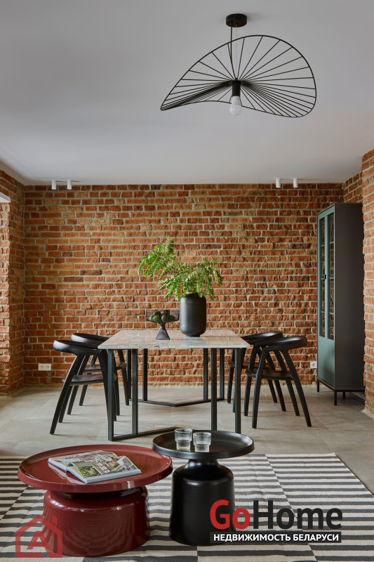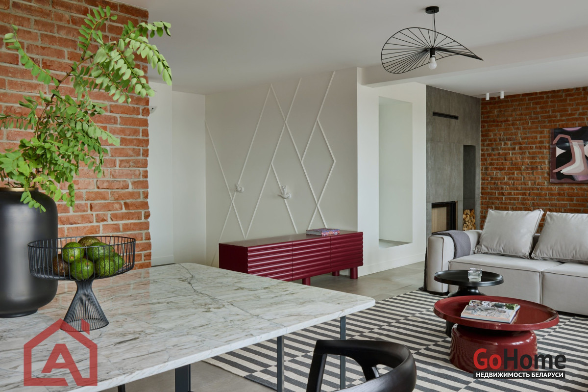 • Второй этаж оформлен в стиле лофт. Стены выложены натуральным красным кирпичом.