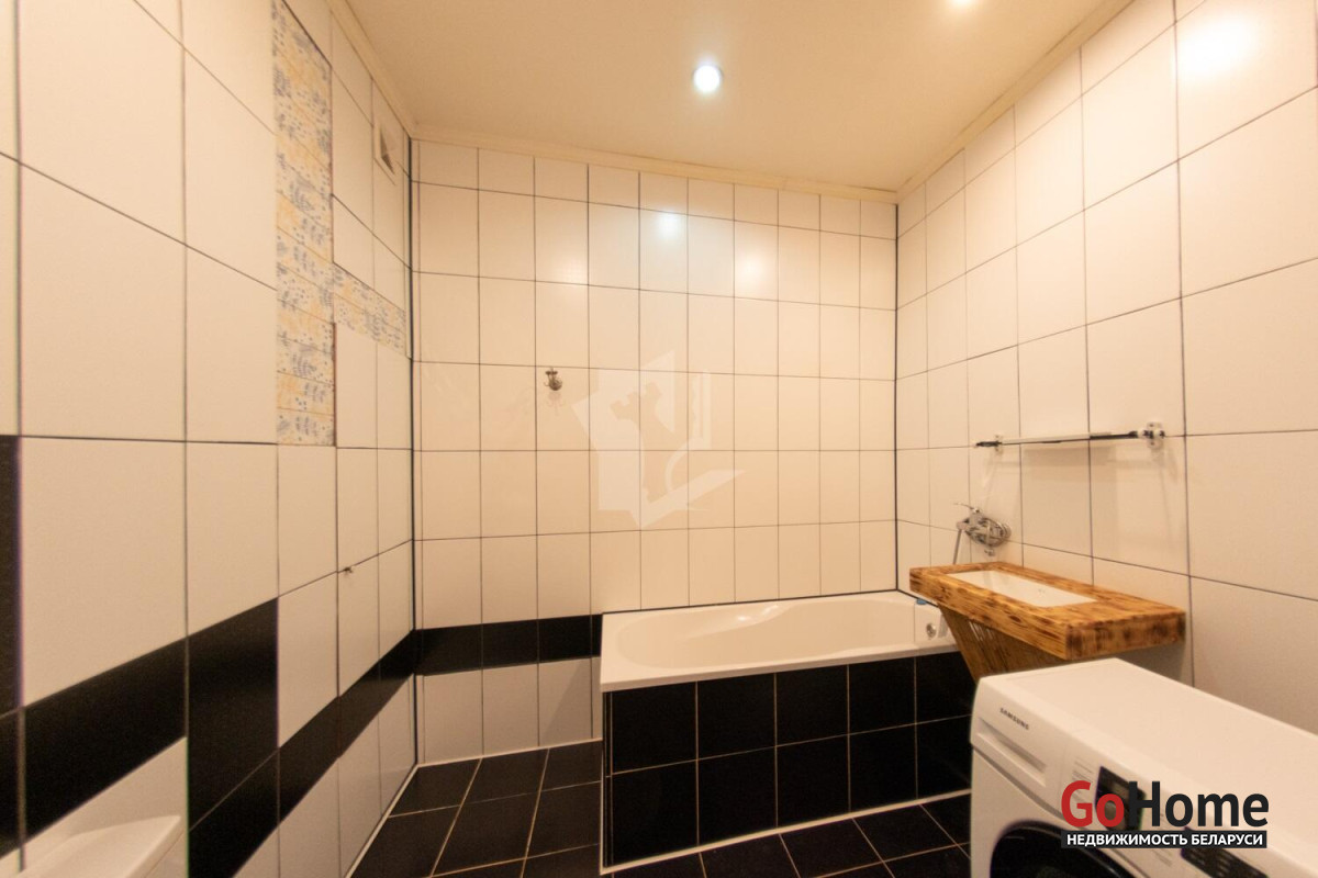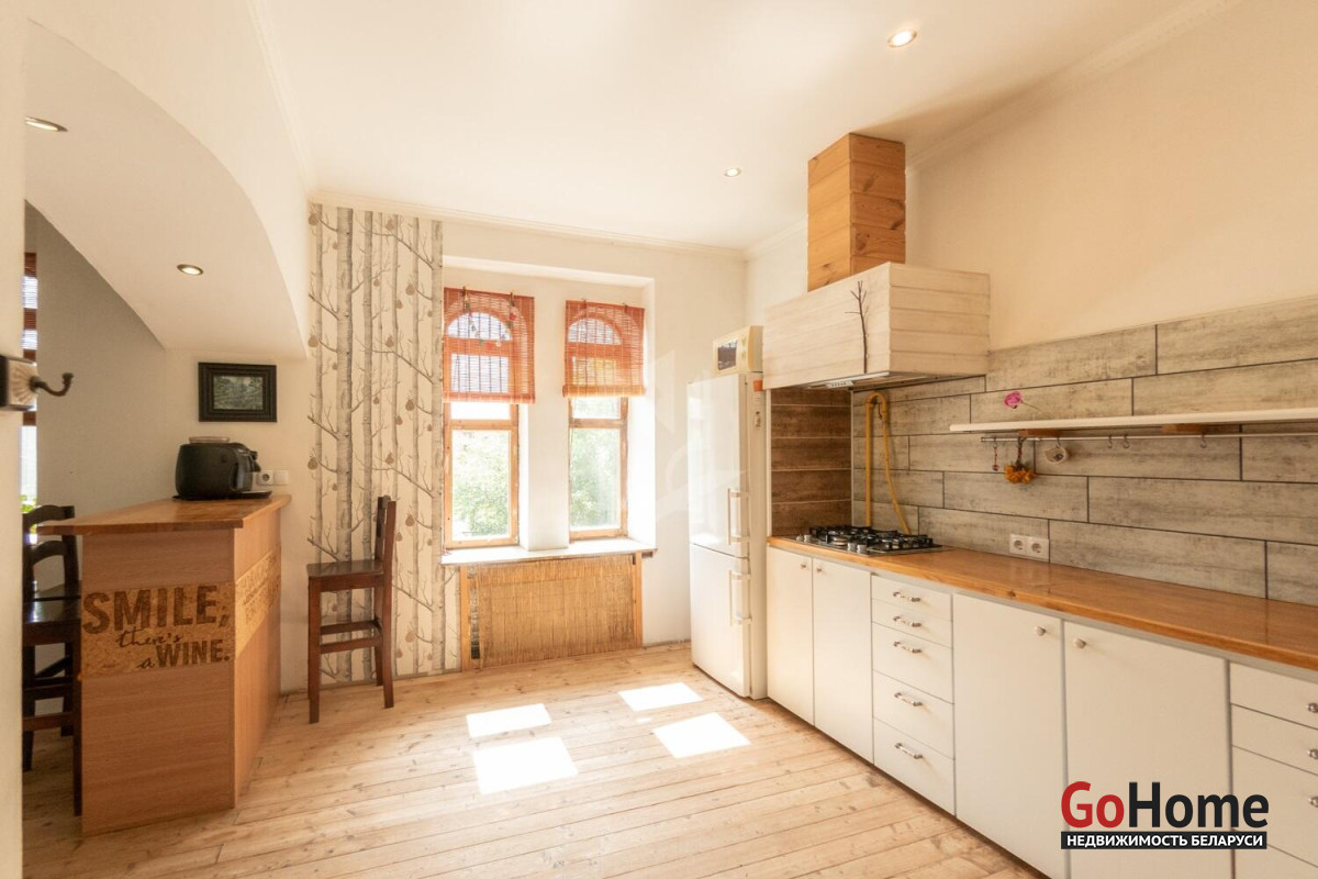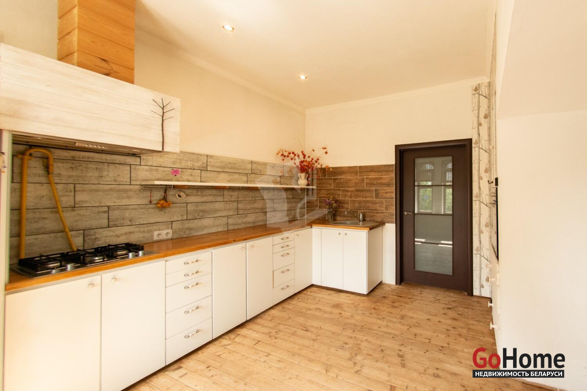 На первом – солнечная кухня, оборудованная современной техникой (холодильник Liebherr, варочная поверхность и духовой шкаф Hotpoint-Ariston, рабочая поверхность выполнена из дуба, также, как и стол). Кухня переходит в просторную столовую. Далее - идеально квадратная гостиная, с окнами, выходящими на две стороны. Изюминка комнаты - норвежская чугунная печь-камин Jotul, выполненная в стиле начала прошлого века. Вас удивит насколько эффективно обогревает помещение эта миниатюрная печь. В спальне на первом этаже установлена шведская гардеробная система Elfa. Просторный санузел, оборудованный подогревом пола. А еще веранда и две террасы: крытая и открытая