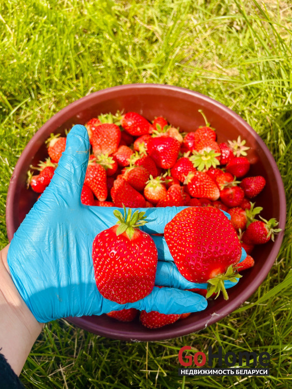 Есть посадки :деревья,клубника,виноград,кусты,цветы.