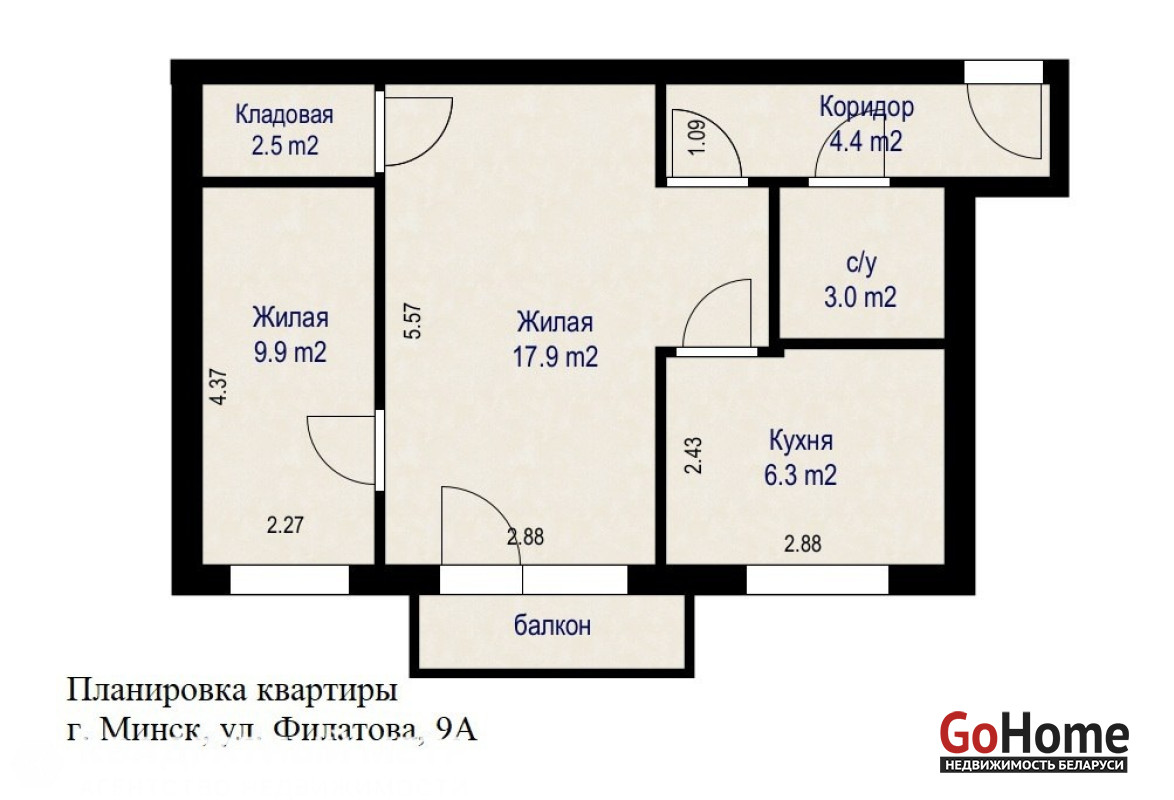 · Комната 9,9 кв.м., проходная комната 17.9 кв.м, кухня 6.3