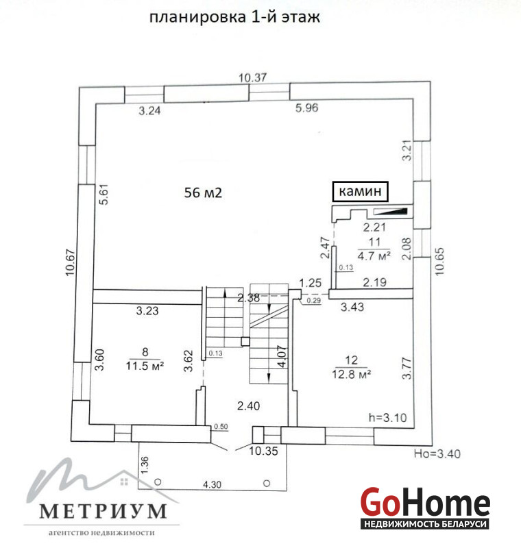 Первый этаж: кухня, просторная гостиная 56 м2 с камином, жилая комната и санузел. Высота потолков 3,10м.