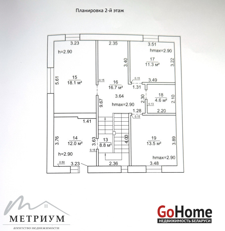 Второй этаж: 4 жилые комнаты, гардеробная и санузел. Высота потолков 2,90м.