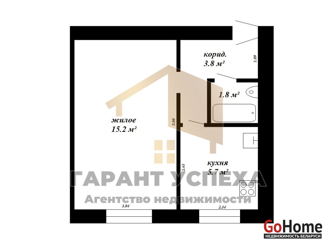 Квартира небольшой, но вместительной площади: 26,5 м2, где жилая составляет 15,2 м2, а кухня - 5,7 м2.