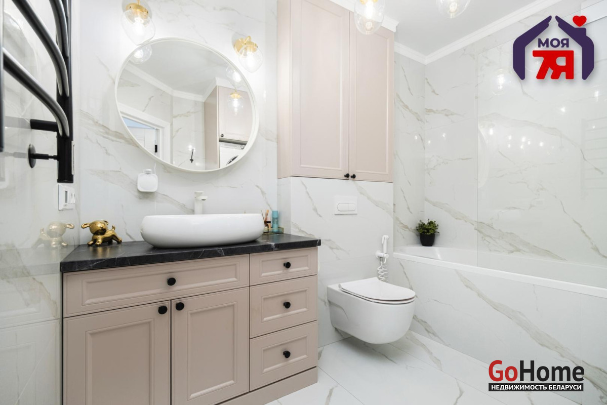 - Ванная комната оформлена в светлых тонах: на стенах и полу - крупноформатный итальянский керамогранит 120×60. Установлена акриловая ванна, смесители Roca, душевая система, биде, стиральная и сушильная машины, бойлер, электрический полотенцесушитель и тёплые полы. Мебель с крашеными фасадами, фурнитура премиум-класса.