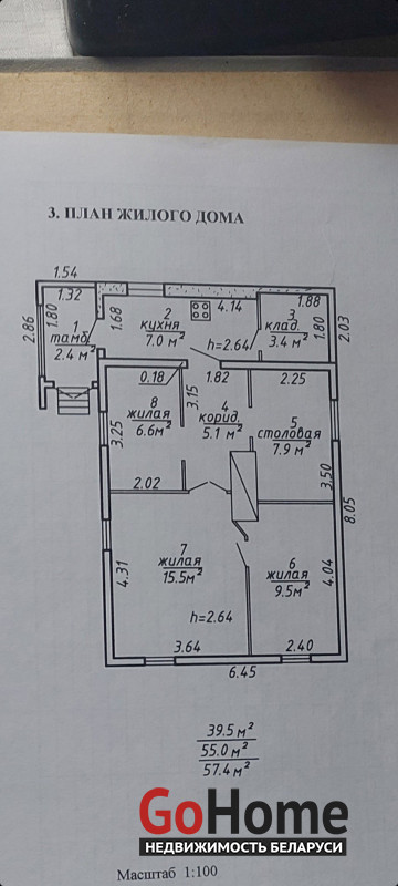 Площадь обьекта 57,4 кв.м., жилая 55кв.м.