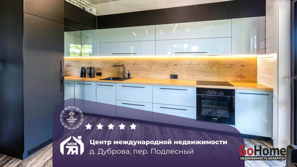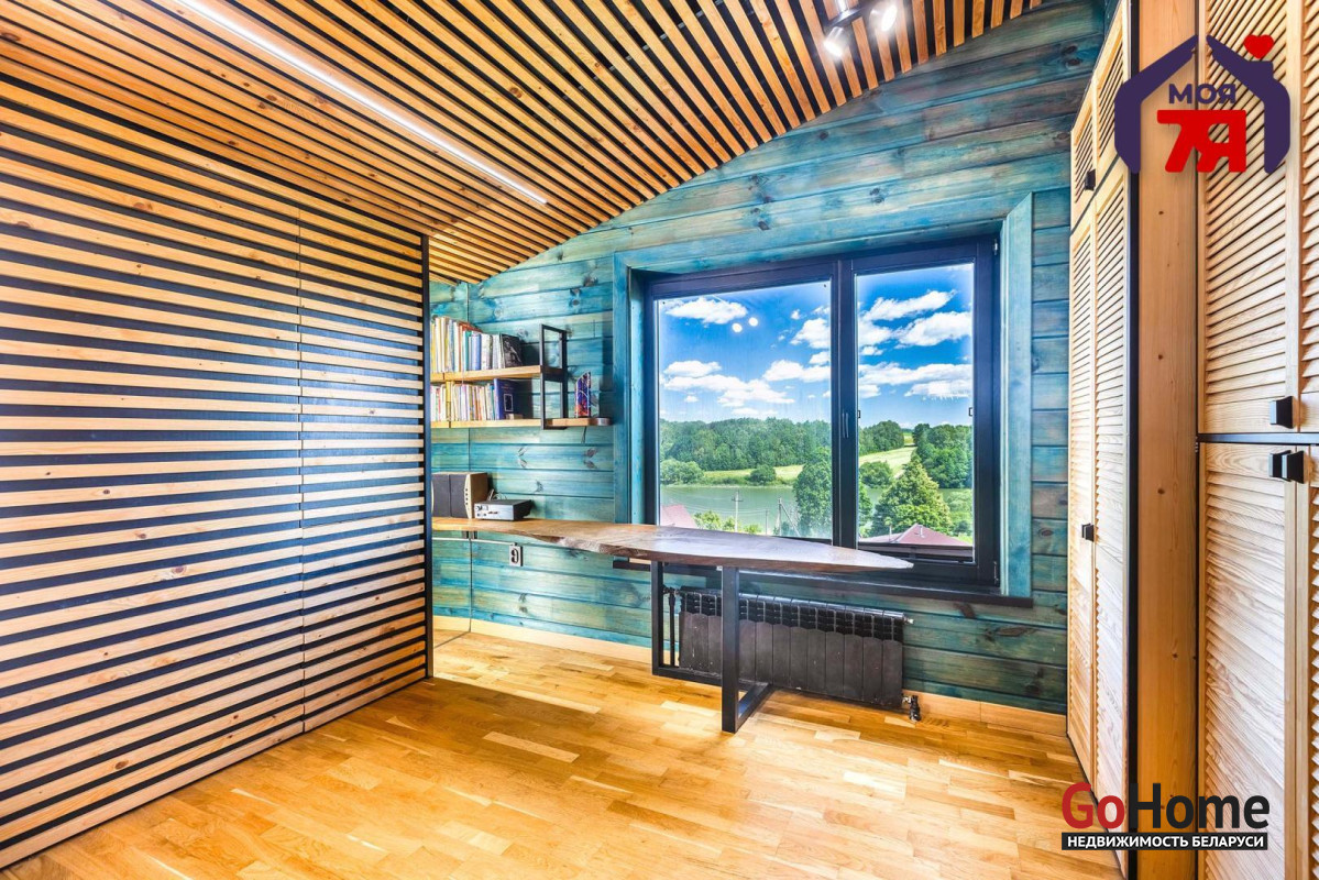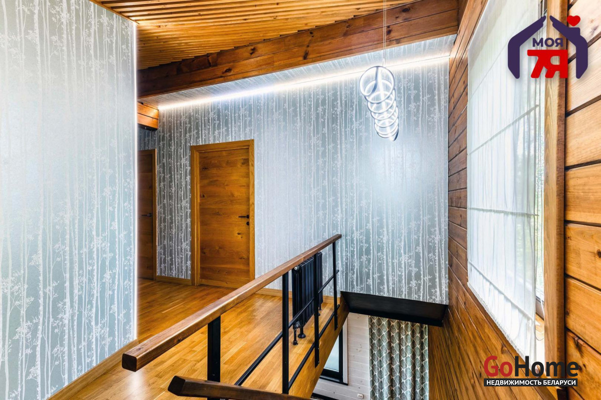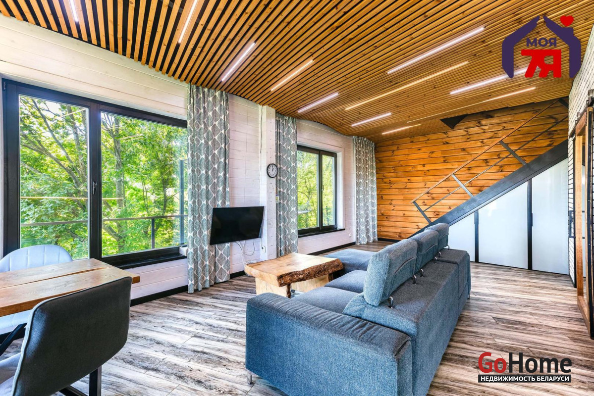 -В отделке использовано натуральное дерево и декоративный кирпич, которые создают атмосферу уюта. Просторная гостиная с панорамными окнами наполняется светом и открывает вид на зелёные пейзажи. Элегантная кухня со встроенной техникой и продуманной подсветкой, а также просторная ванная с видом на природу и качественной сантехникой подчеркивает высокий уровень комфорта этого дома.