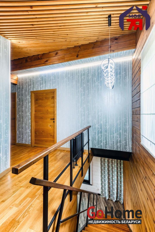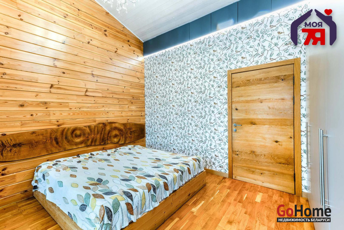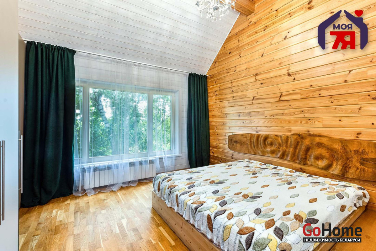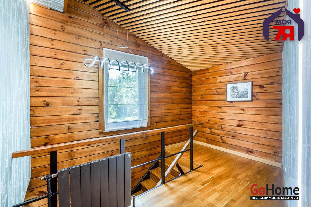 -В отделке использовано натуральное дерево и декоративный кирпич, которые создают атмосферу уюта. Просторная гостиная с панорамными окнами наполняется светом и открывает вид на зелёные пейзажи. Элегантная кухня со встроенной техникой и продуманной подсветкой, а также просторная ванная с видом на природу и качественной сантехникой подчеркивает высокий уровень комфорта этого дома.