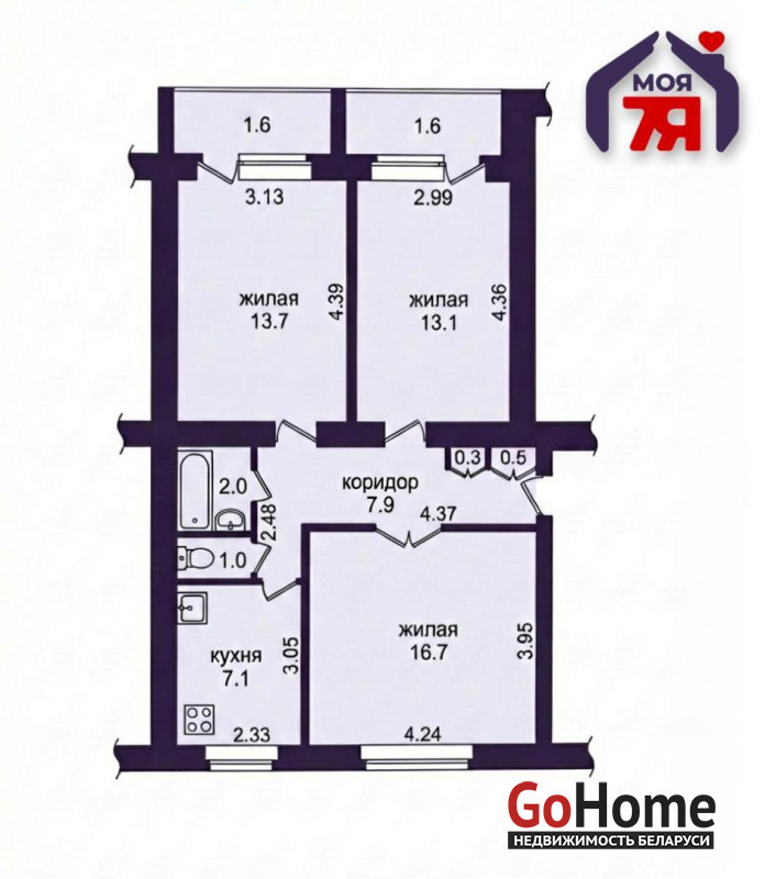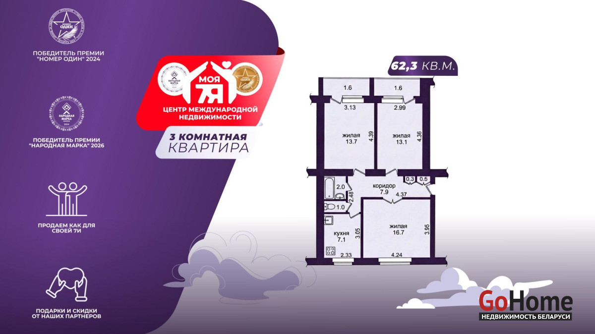 - Общая площадь квартиры составляет 62,3 м2. 3 изолированные жилые комнаты 16,7 м2, 13,7 м2 и 13,1 м2, а также вместительная кухня 7,1 м2.
