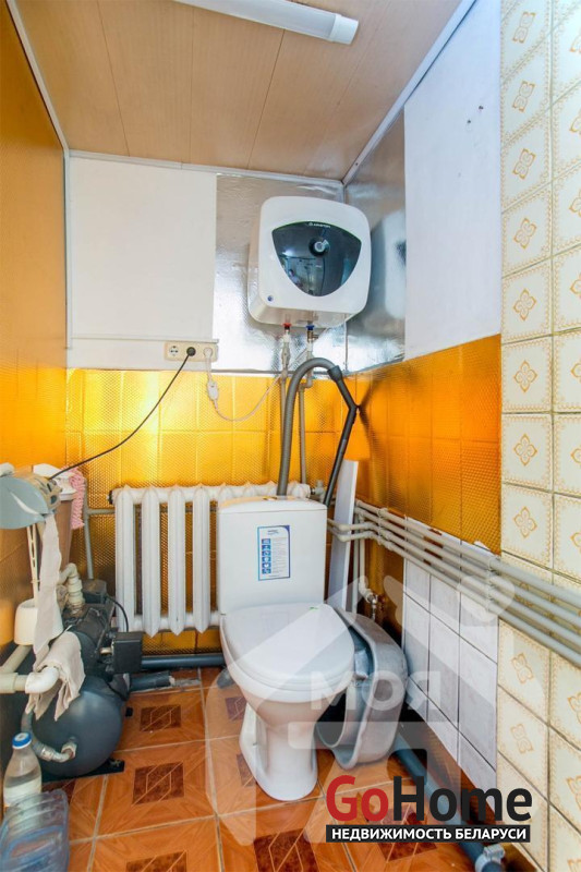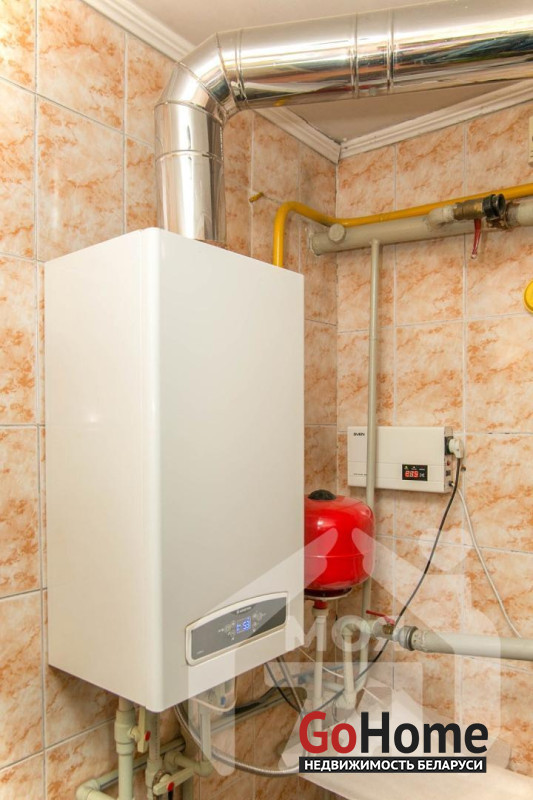 -Отопление газовое, с котлом, при этом сохранён твердотопливный котёл как резервный вариант - это разумное решение с точки зрения автономности. Вода заведена в дом, канализация местная.