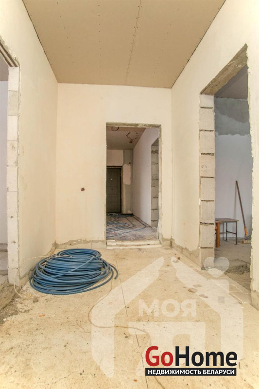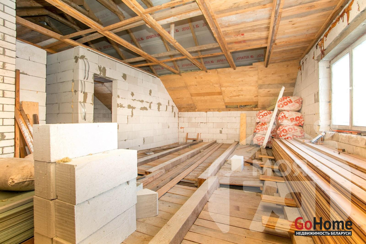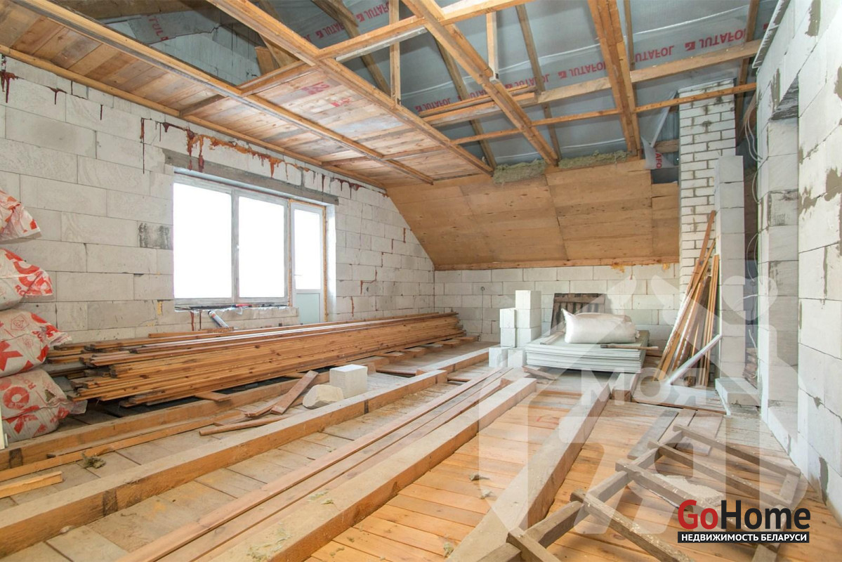 -Внутри уже выполнен большой объём подготовительных работ. По первому этажу разведена электрика с полуавтоматами, частично смонтированы тёплые полы, вся комплектация для них уже куплена и остаётся новому владельцу. Стены первого этажа оштукатурены и частично зашпаклёваны, подшит черновой потолок.