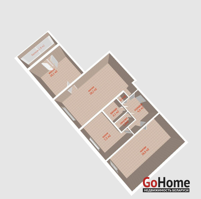 Площадь: 63.1 м2 (по СНБ) / 61.2 м2 общая / 45.1 м2 жилая.