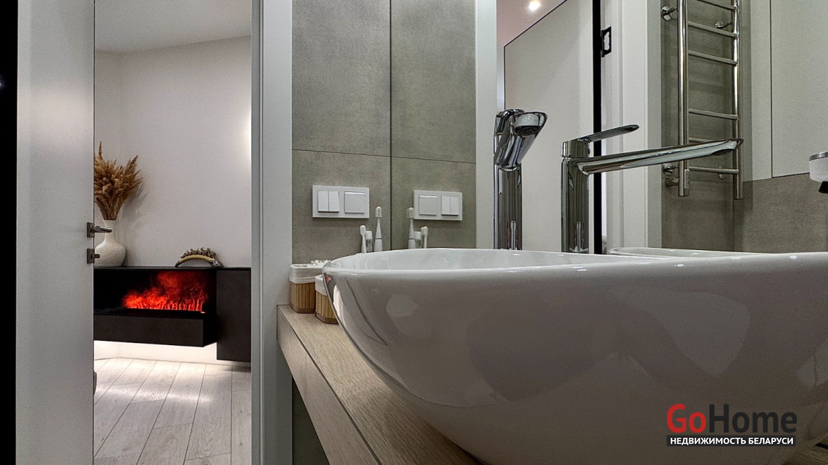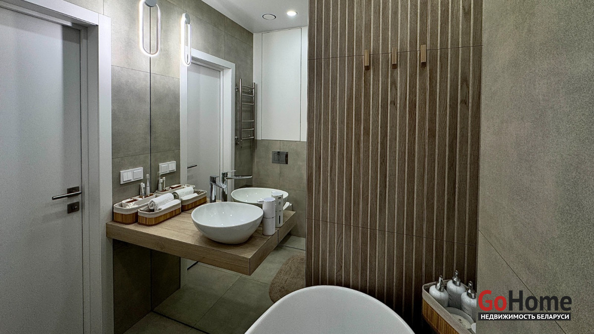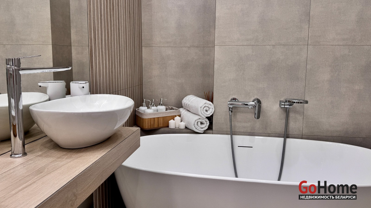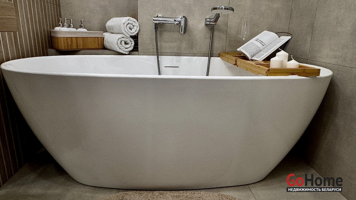 В санузле отдельностоящая ванна, итальянская плитка, бойлер.