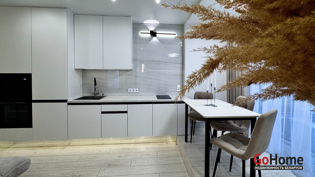 Кухня оборудована встроенной техникой. Выделена отдельная столовая зона с раздвижным столом.