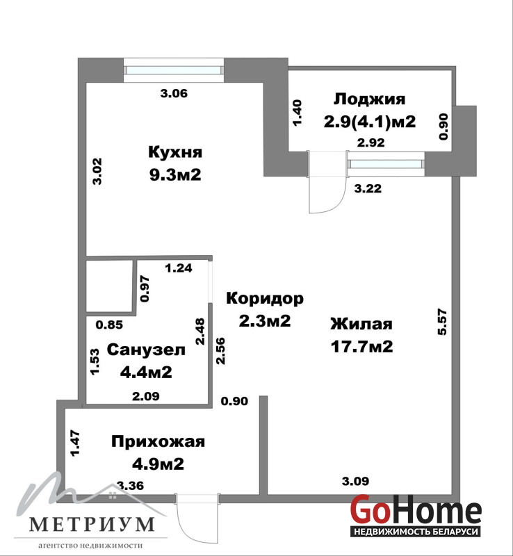 · Кухня 9,3 м2 — достаточно места для кухонного гарнитура и обеденной зоны.