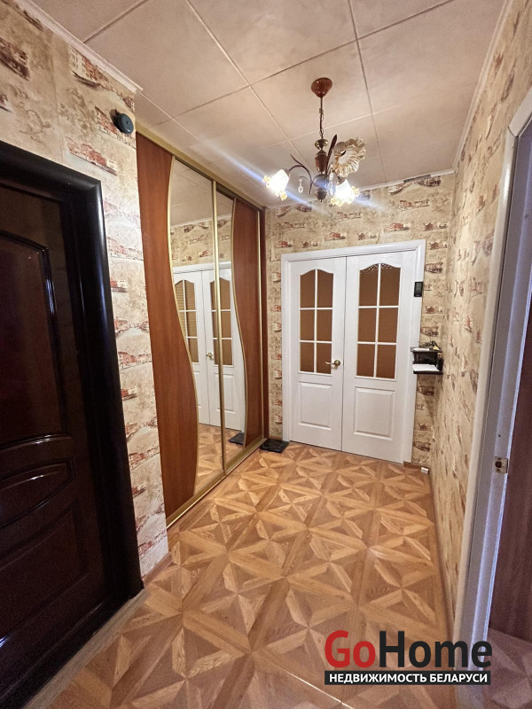 Стены выровнены и загрунтованы. По всей квартире ламинат, пол не скрипит. Потолки натяжные. Двери все новые, ванная новая (акрил). Установлены счетчики на воду и на газ. Вентиляция домовая функционирует. Квартира теплая, дом весь утеплен. Тамбур на 2 квартиры с ремонтом, что очень удобно. Соседи спокойные, дом тихий. Мебель можем оставить, по вашему желанию.