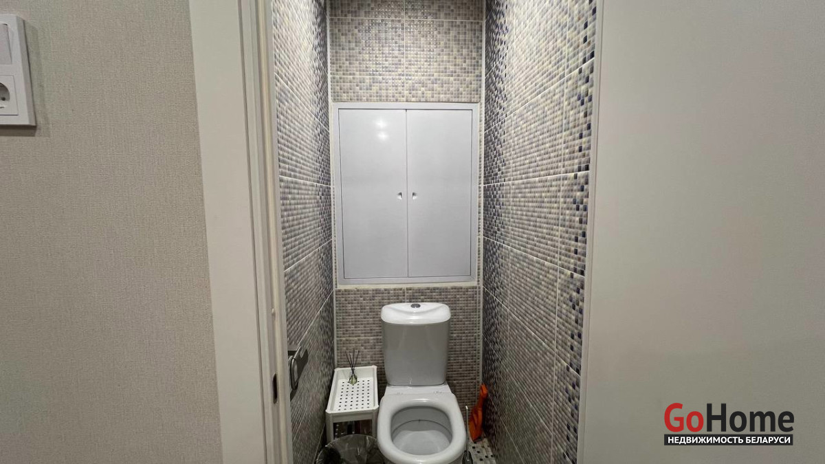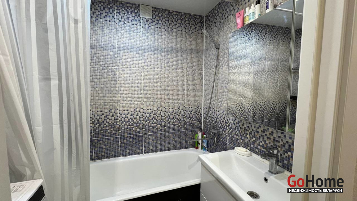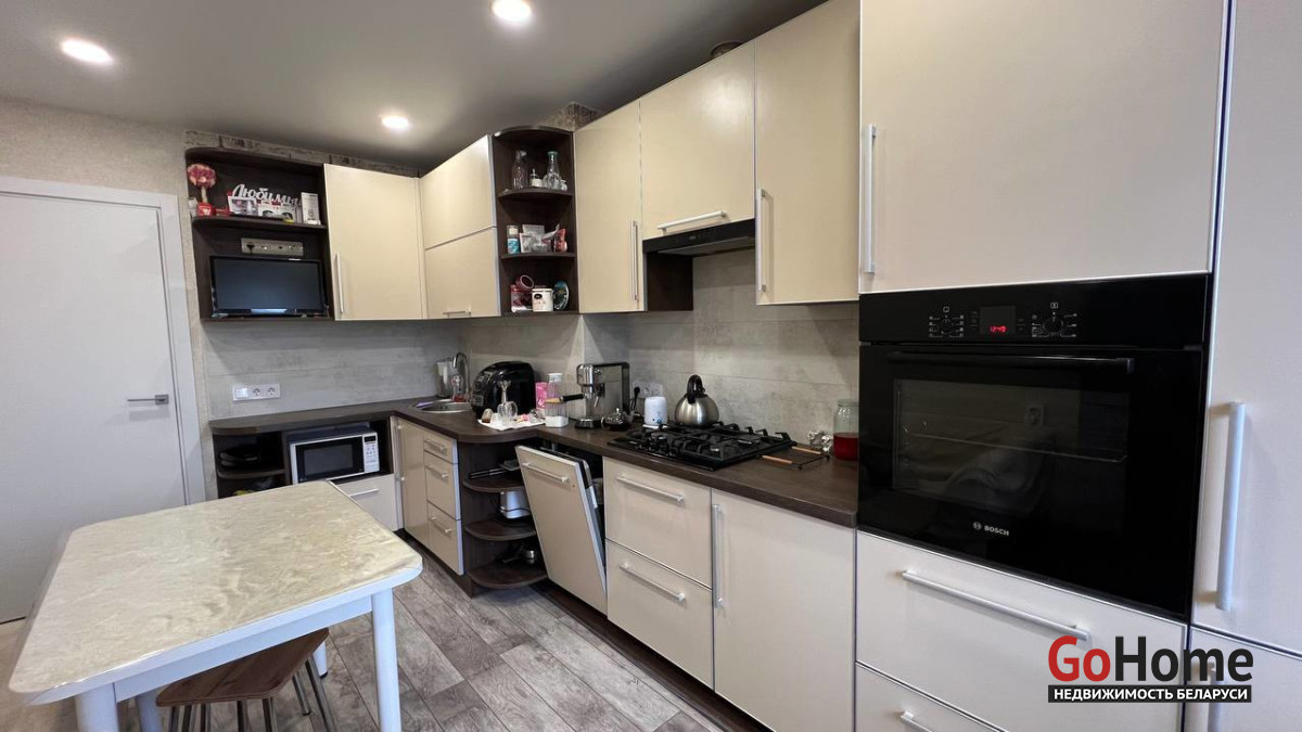 В ванной комнате и санузеле уложена одинаковая светлая плитка, остаются только зеркальный шкафчик и тумба под раковину. Встроенная кухня с посудомоечной машиной и варочной панелью также входит в стоимость квартиры.