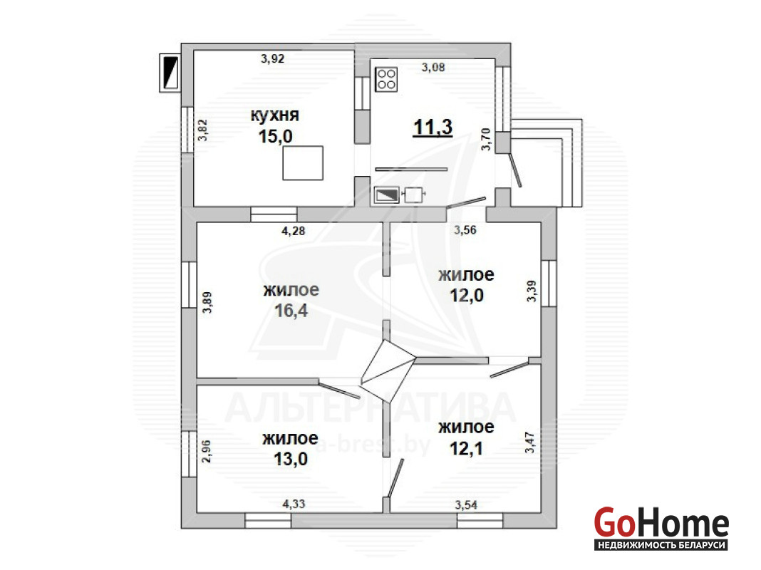 Жилой дом в г.Кобрине. 1989 г.п. 1этаж. Общ.СНБ - 79,8 кв.м, общ.- 79,8 кв.м, жил.- 53,5 кв.м, кух.- 15,0 кв.м. 4 комнаты, высота потолка - 2,65 м.