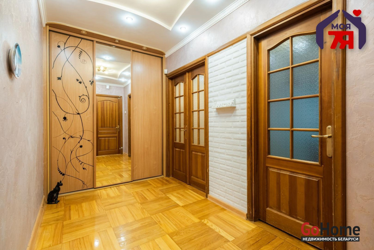 - Ремонт выполнен с вниманием к деталям: натуральный деревянный паркет в жилых комнатах, плитка на кухне и в санузлах - сочетание долговечности и практичности. Подвесные потолки с точечным освещением создают мягкий световой контур, а в коридоре декоративная отделка под фактурный камень делает пространство не просто проходным, а оформленным и законченным. Установлены ПВХ окна, входная дверь металлическая