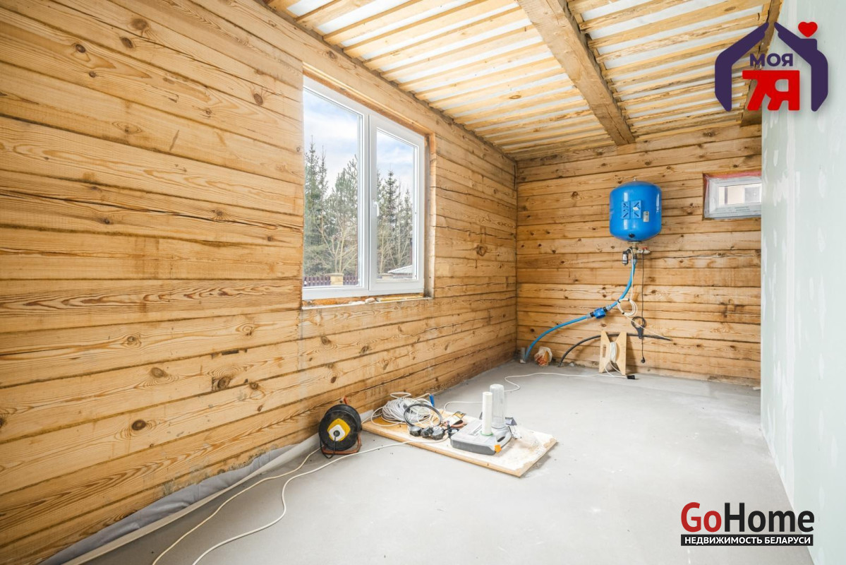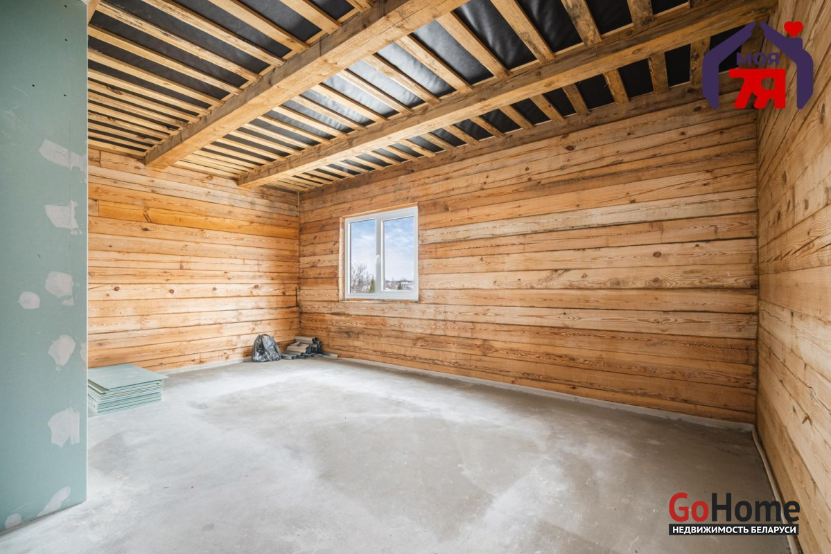 - На первом этаже выполнена бетонная стяжка, на втором — фанера, уложенная в уровень, готова к чистовой отделке. Мансарда утеплена современным материалом эковатой, который сохраняет тепло зимой и прохладу летом.