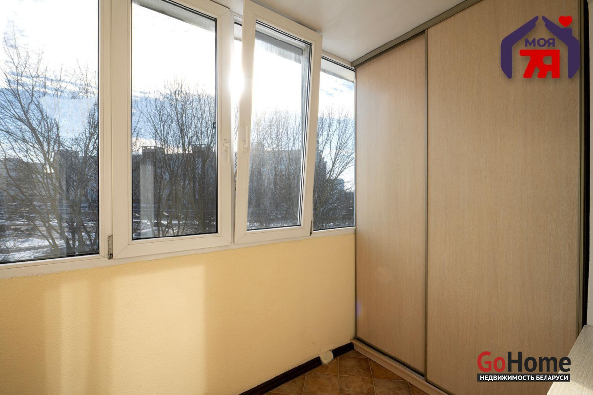 -Из просторной жилой комнаты есть выход на застеклённую лоджию, что даёт возможность использовать её как дополнительное пространство для отдыха или хранения. Здесь установлен шкаф, что удобно для хранения вещей.