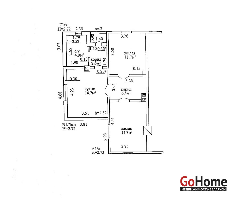 Общая площадь квартиры 54.6 кв м, жилая 26 кв м., кухня 14 .7кв.м,