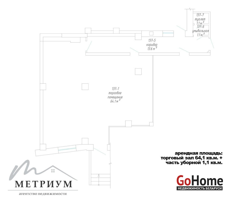 · Состояние помещения: Площадь 65,2 кв. м. Выполнен светлый функциональный ремонт: потолок типа ARMSTRONG, пол - керамическая плитка. Большие витринные окна обеспечивают отличное естественное освещение в течение дня.