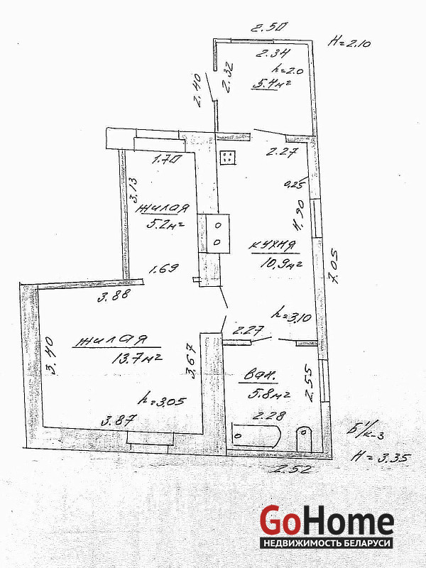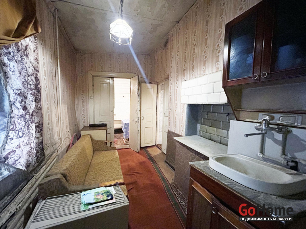 Квартира с отдельным входом в блокированном двухквартирном доме. В жилом состоянии, под ремонт. Двойные деревянные окна, дощатые полы, стены оштукатурены. Сохранена печь. Отопление, водоснабжение, канализация - центральные. Квартира состоит из дощатых сеней, кухни, совмещенного санузла и двух комнат, одна из которых проходная. Высокие потолки – 3,35 м.