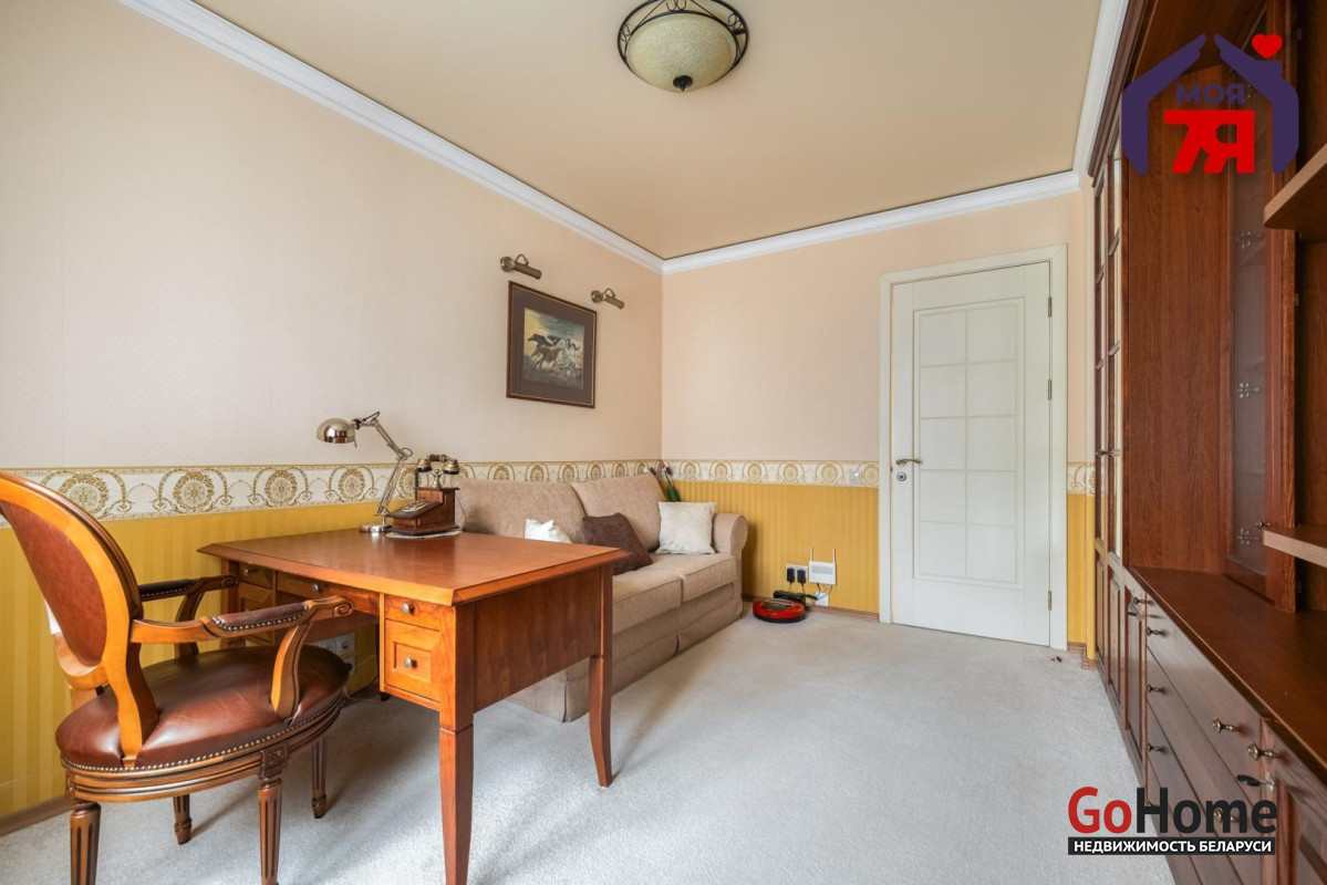 - Кабинет с встроенной мебелью во всю стену и рабочим столом. Большое окно обеспечивает естественное освещение для продуктивной работы.