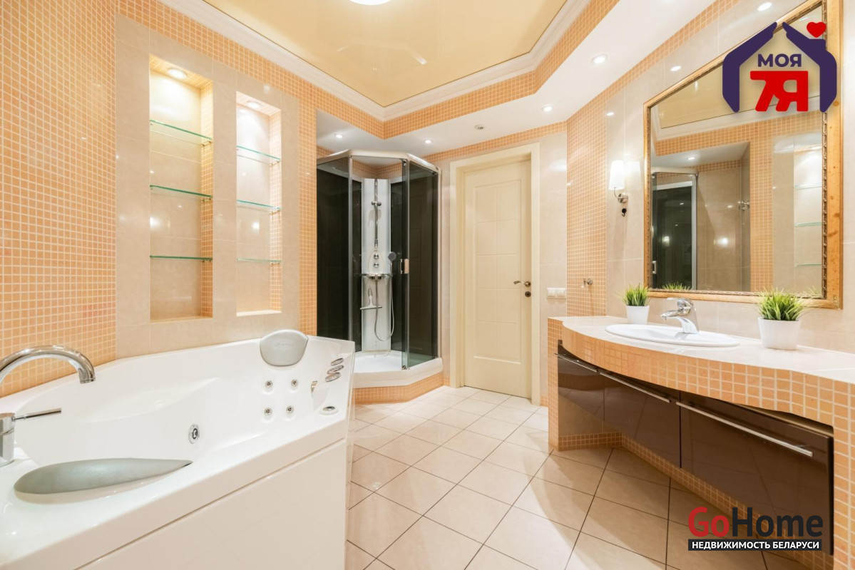 - Санузел совмещенного формата оснащён джакузи и душевой кабиной. Плиточная отделка и подсветка создают аккуратный визуальный облик. Установленное оборудование позволяет сразу пользоваться всем функционалом.