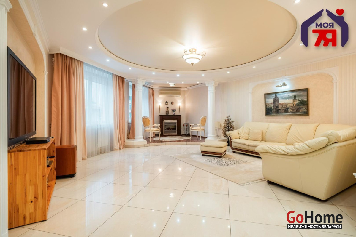 - Гостиная впечатляет простором и изысканным интерьером. Круглая потолочная композиция с подсветкой, колонны и декоративный камин подчёркивают архитектурную эстетику пространства. Большие окна наполняют комнату мягким светом, а удобная зона отдыха гармонично завершает интерьер.