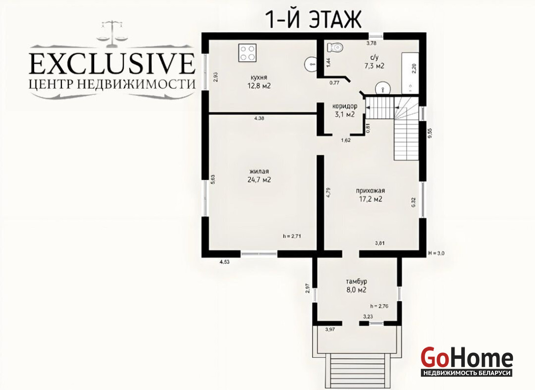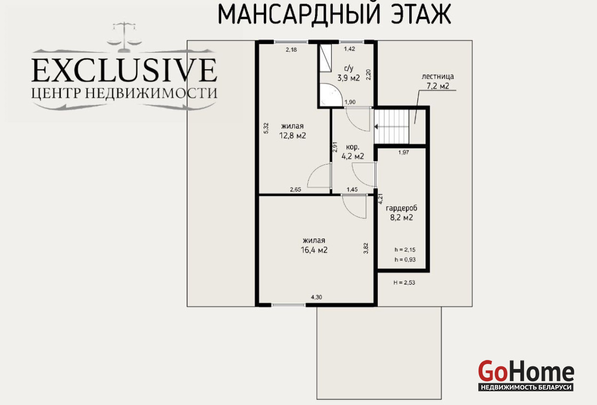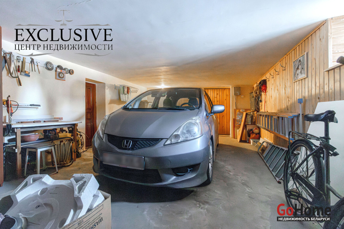 В подвале находится комната с выходом в отапливаемый гараж. На первом этаже большая гостиная 24.7 кв.м., просторная кухня 12.8 кв.м., прихожая. На мансардном этаже две спальни и две гардеробные. На каждом этаже имеется санузел.