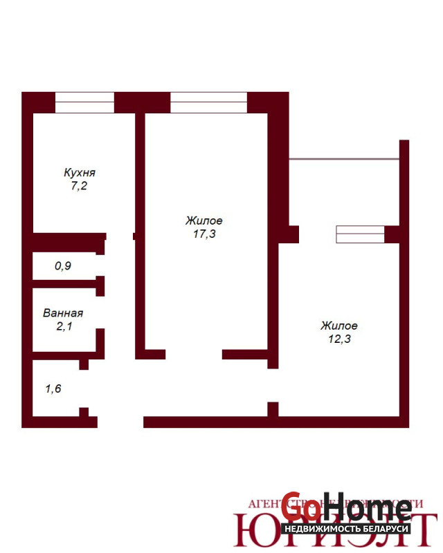 Общая площадь - 52,3 кв.м, жилая - 29.6 кв.м, кухня - 7.2кв.м. Из спальни выходит лоджия, есть кладовка.